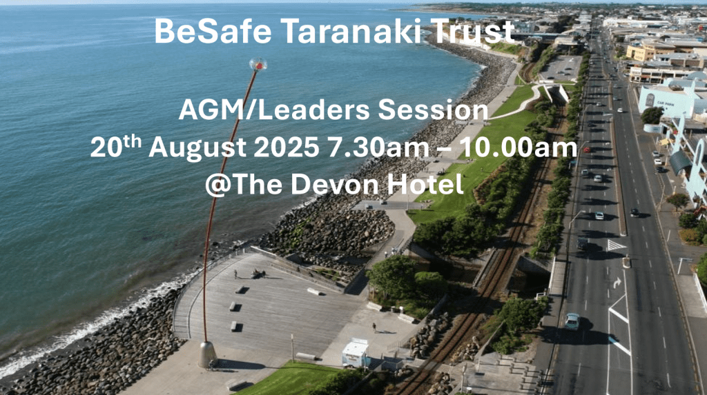 BeSafe Taranaki Trust AGM will be held on the 22nd August 2024 at 7.00am – 10.00am at the Devon Hotel